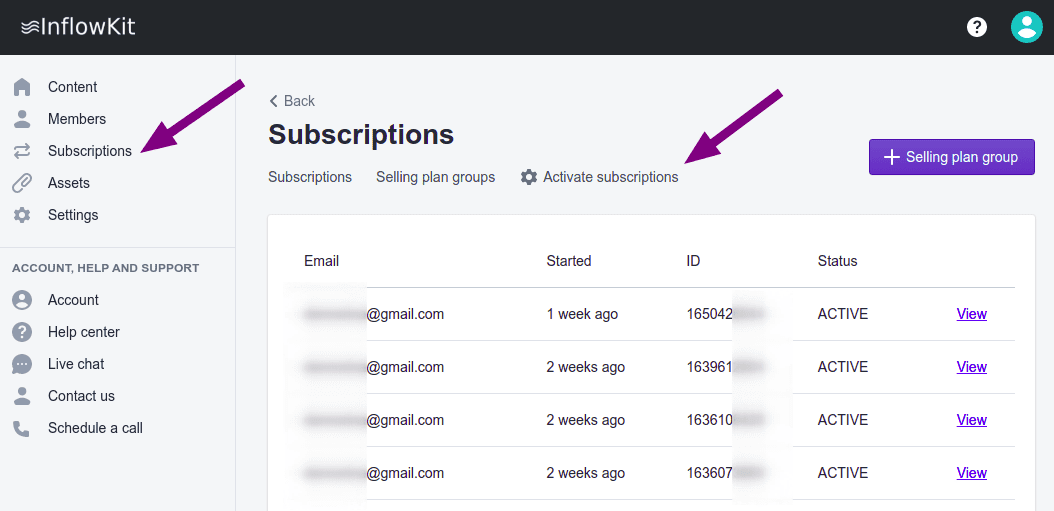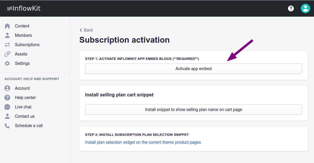 - On the page that opens ensure that Inflowkit subscriptions is activated if not, activated it by clicking